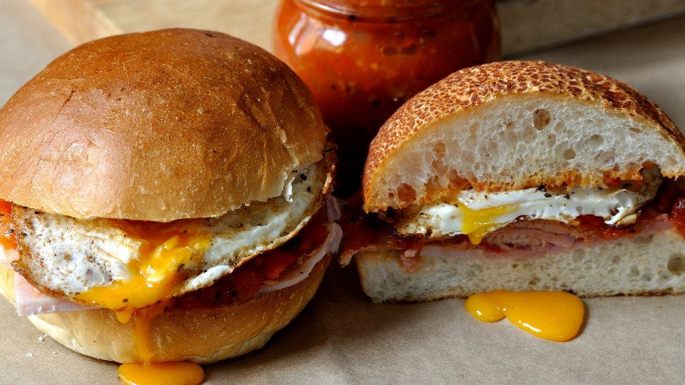 - Cut the bread rolls in half and spread on some of the relish. Stack on the sliced Christmas ham and then carefully place the fried egg on top. Season with some salt and pepper.