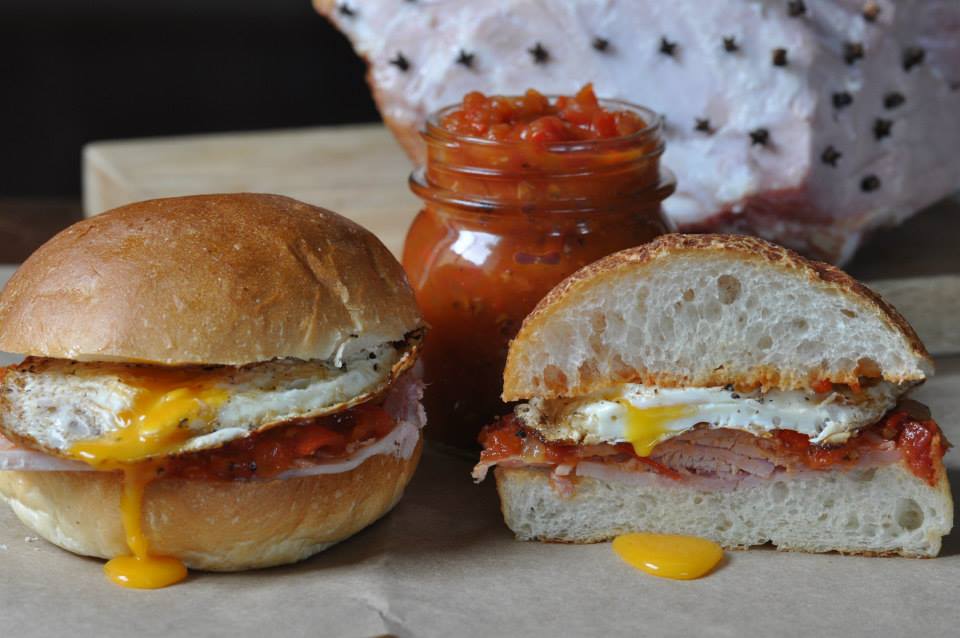 Breakie Burgers with Christmas Ham and Spicy Tomato Relish