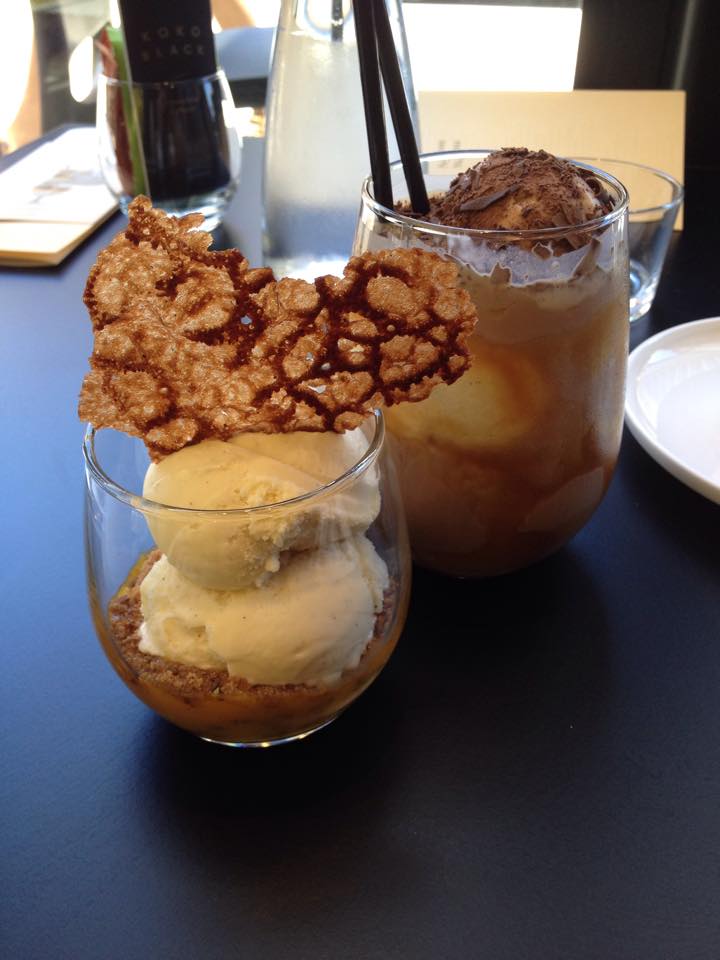 Lady T, my stylish lunching companion, and I perched at a corner table near the window so we could people watch while we enjoyed our special lunch. Both of the new Summer desserts presented beautifully. I may have actually squealed with delight and clapped a little when they appeared. The iced chocolate came with two generous scoops of ice cream, sprinkled with an abundance of chocolate flakes and the glass had been dramatically streaked with beautiful, golden salted caramel. It was hard to know whether to attack it with a straw or a spoon. So we kicked things off with a straw and it was just so wonderfully rich, but pleasingly not overly sweet. It was a big kid’s chocolate milk, with the added luxury of the ice-cream and that lovely salted caramel, so yes, the spoon was also required. It was a meal in itself and I was glad to be sharing so there was still room for the second summer sensation.