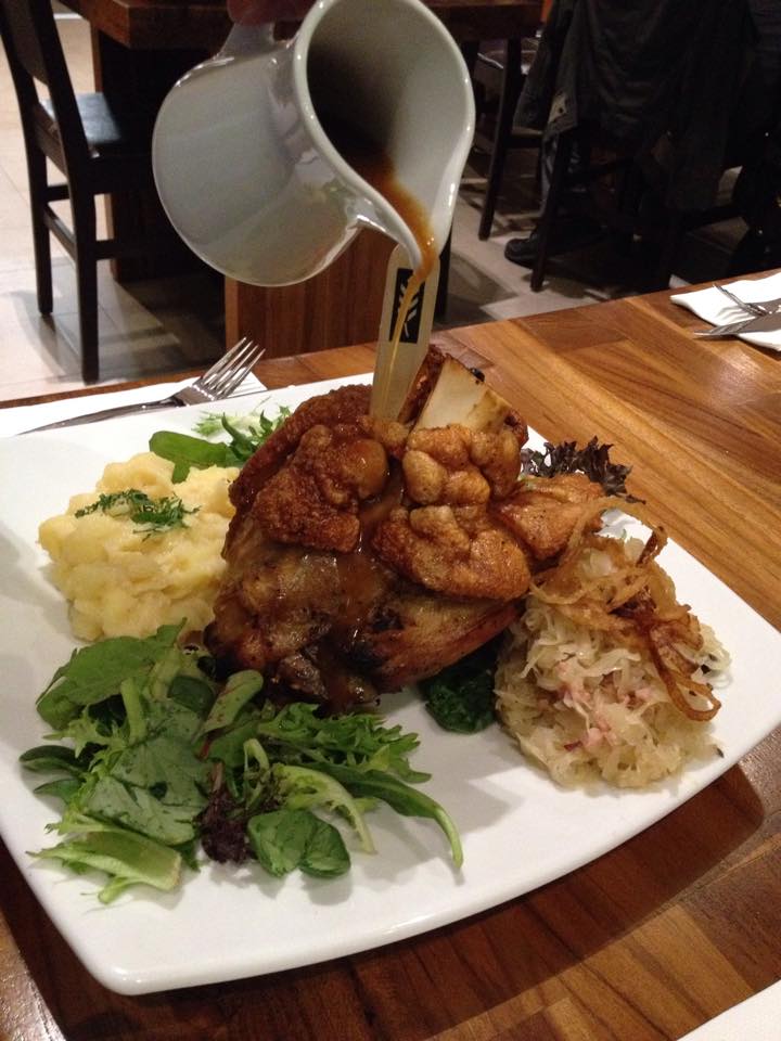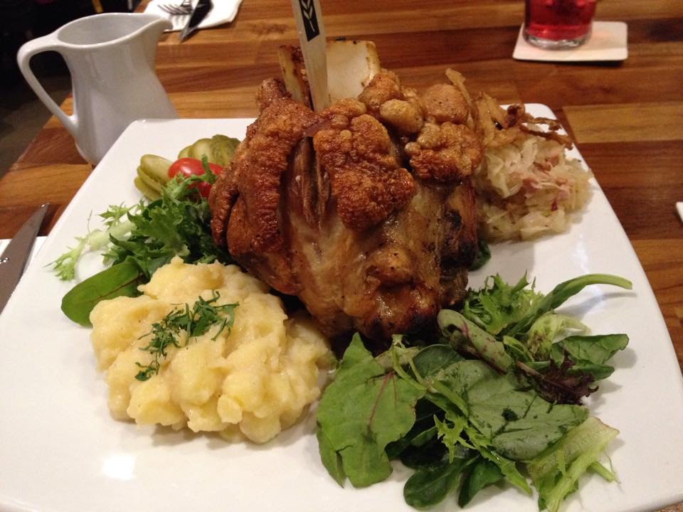 The menu is a decent size, but helpfully is broken into sections and also comes with pictures of the dishes which can be handy when they are listed by their German name. Now I think GG knew what he was going to order even before he arrived. The pork knuckle had his name on it. Schweinshaxn / Oven Roasted Pork Knuckle: Oven roasted hind shank of grain-fed pork served with potato salad, sauerkraut and homemade sauce on the side. He’d tried to order it elsewhere recently and his endeavours had been thwarted and so I think he was pleased as punch to order it here.