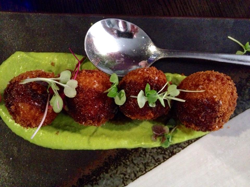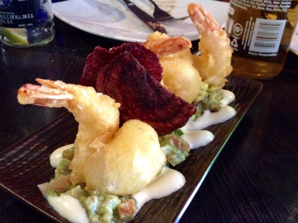 Following next was one of the dishes my good friend Lady K had told me all about – Goats cheese, orange blossom honey. I mean come on! The menu description alone has you reaching eagerly for the fork. It had the heat from the crispy outer coating of the deep fried cheese, then the decadent oozy and creamy goats cheese centre with just a hint of salt, which was the perfect contrast to the sweet honey. It was bliss. If you are a cheese fan then this is a delicious and totally indulgent way to eat cheese. Now along with this taste sensation also came some Chickpea Battered Prawns, Guacamole, Aioli. These dishes were both big hits. I would have happily not shared these two and called it quits here but there were many things still to try, so bring it on!