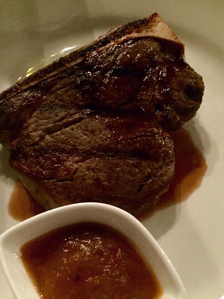 We were eager to tuck into the mains when they arrived. I’d never seen a fillet served on the bone, gave it a bit of a rustic look as though you could use the bone as a handle for some sort of meat lollipop. Thankfully that thought didn’t enter GG’s mind and he politely tackled his steak with a knife and fork. I did try a bite or two of his fillet and along with some of the spiced chutney that came with it, it was a nice piece of meat. However GG didn’t seem convinced that the $54 price tag was warranted. Granted that is a pricey steak.