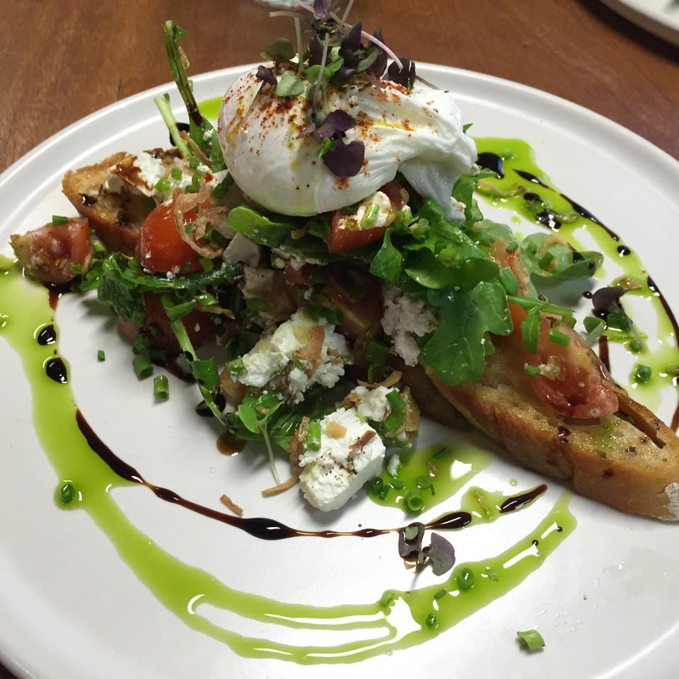 Breakfast Bruschetta – Poached Egg, Rocket, Cherry Tomato, Avocado, Fetta, Fried Shallots on Ciabatta