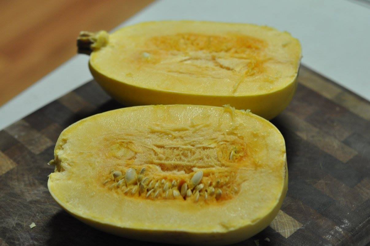 - Cut spaghetti squash length ways in half, remove seeds, then drizzle with olive oil and a generous sprinkle of cracked pepper and rock salt.