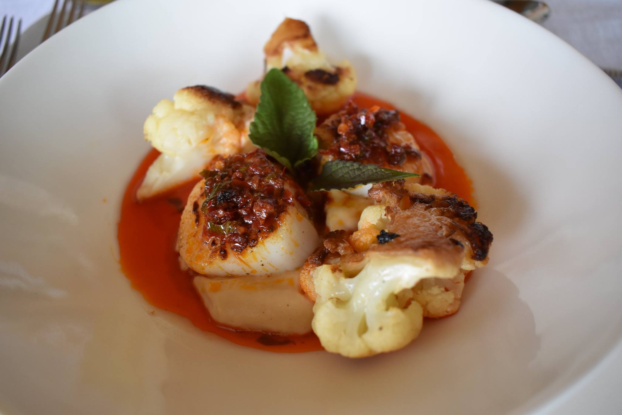 - Entrée: Pan Roasted Scallop, Cauliflower, Nduja Vinaigrrette