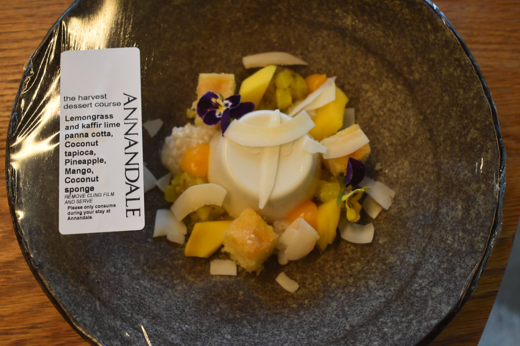 - Dessert: Lemongrass kaffir lime panna cotta, Coconut tapioca, pineapple, mango, coconut sponge
