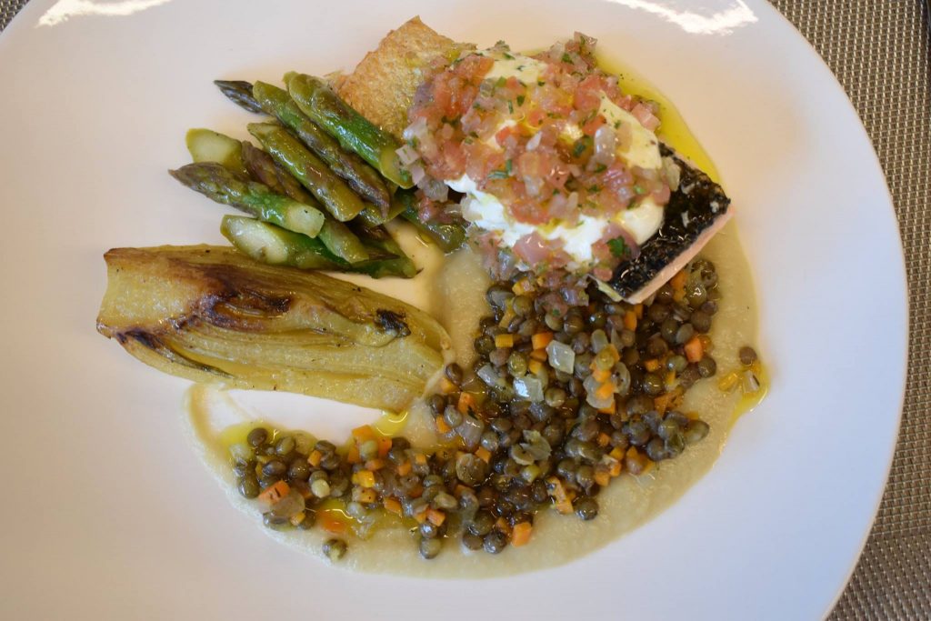 - Mains: Akaroa Salmon, French Lentils, Fennel, Citrus Yoghurt, Sauce Vierge, Annandale Garden Asparagus