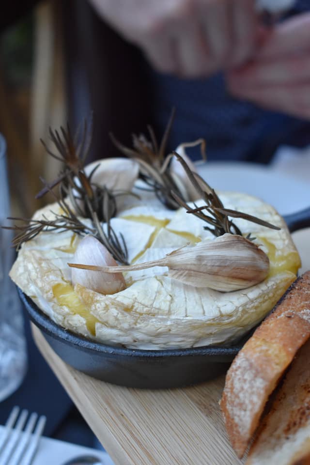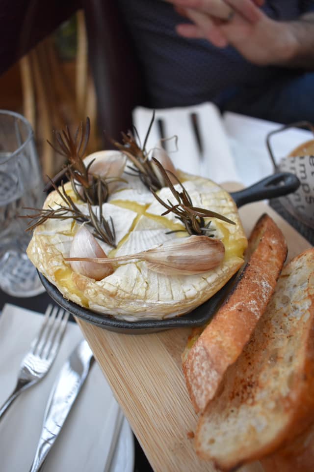 Baked Camembert Fondue Studded with Rosemary & Garlic, served with Honey Assortment of Bread, Crackers & Lavosh